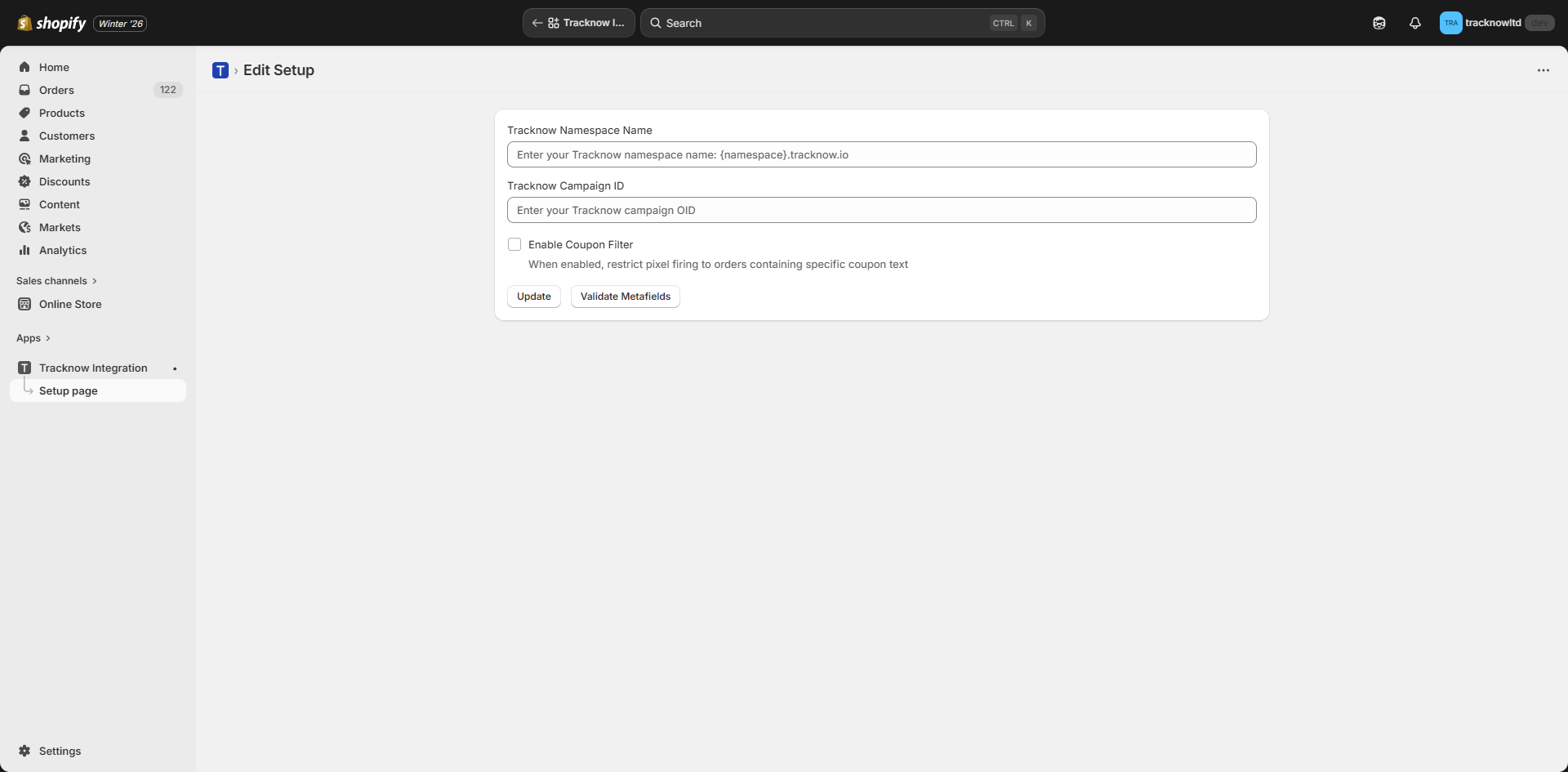 Navigate back to the Shopify dashboard → Open the Tracknow Integration app → Setup Configuration