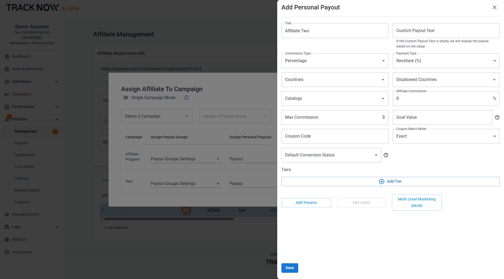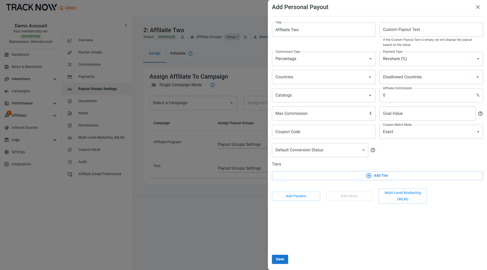 Click **Add Personal Payout** on the row of the relevant campaign and configure the payout according to the personal agreement with this affiliate.