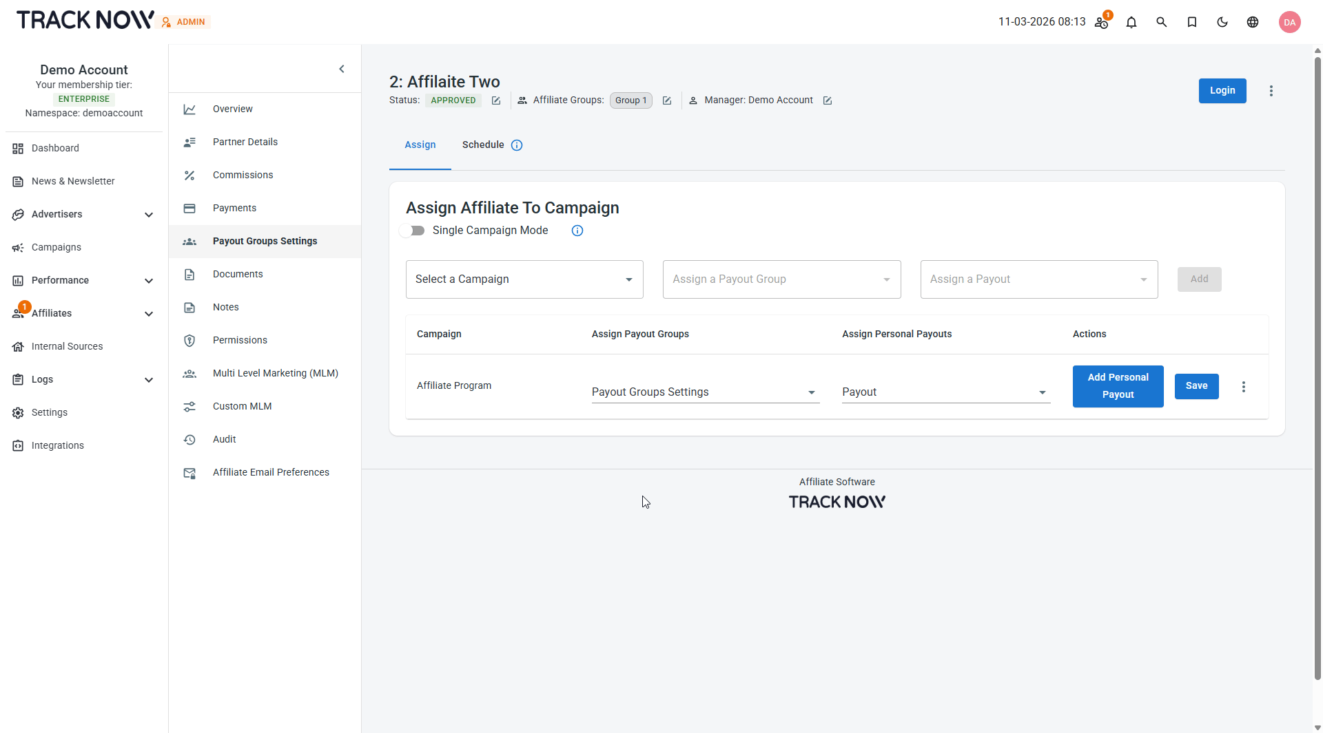 On this screen, you can assign the affiliate to campaigns they are not yet part of.\